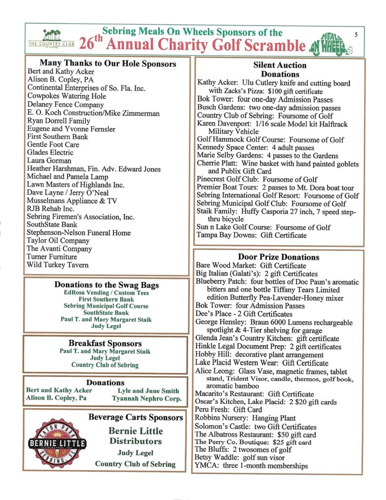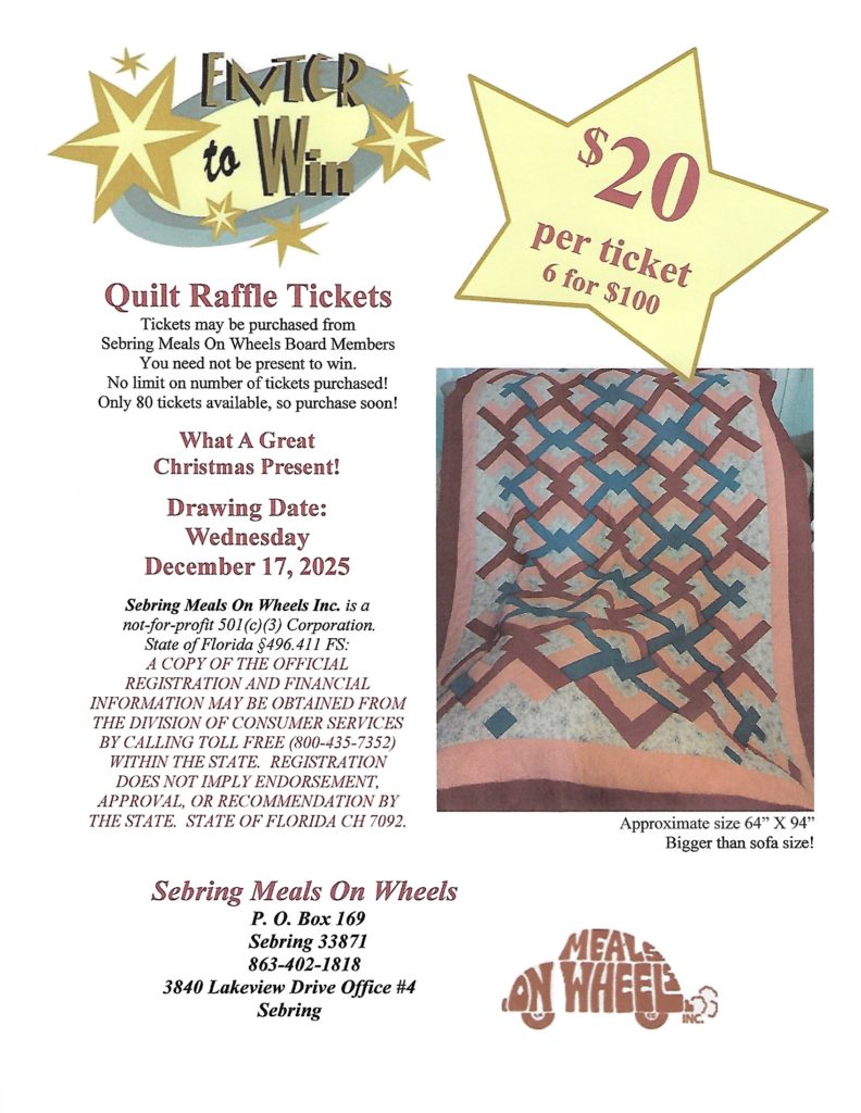 All proceeds from any fundraising event support the expenses of delivering meals and the operational expenses of the organization. Sebring Meals On Wheels relies on the community for support, through donations and through fundraising. to continue the program of delivering hot lunches within the Sebring and Lake Placid areas.